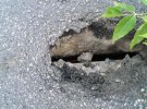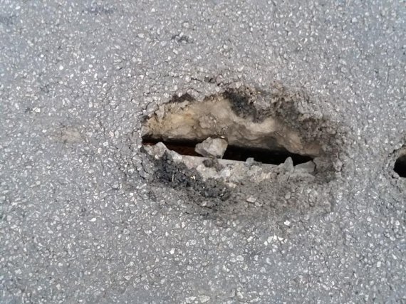 Текст проілюстрований світлинами, на яких видно глибокі ями на дорозі. З-під асфальту проглядають елементи бетонної конструкції.