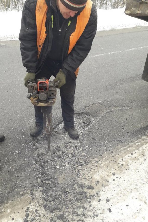 "Використовують холодний асфальтобетон, бо він дає змогу працювати при низьких температурах. Будівельний матеріал укладаємо власного виробництва. Ліквідує ямковість Котелевський райавтодор", - розповіли у прес-службі організації.