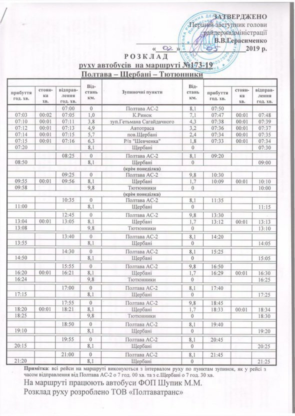 Розклад нового маршруту №173-19 (Полтава - Щербані - Тютюнники) розробило ТОВ "Полтаватранс". Тут працюють автобуси ФОП Шупик М. М.