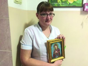 Тетяна 13 років працює в районній лікарні медсестрою при терапевтові. Зустрічаємося в її робочому кабінеті. Накинула білий халат. В окулярах. На стіні — вишита нитками ікона Божої матері.