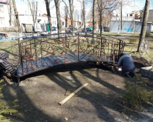 "Бригада благоустрою встановлює місточок для закоханих у парку навпроти селищної ради. Найближчим часом облаштують штучну водойму", - йдеться в дописі.