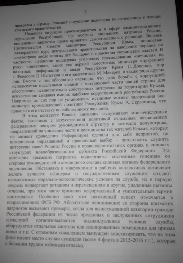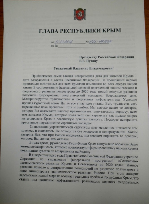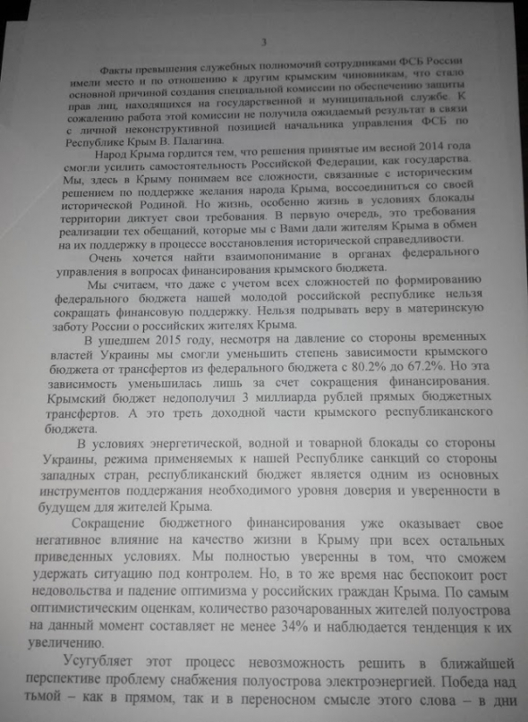 У ньому Аксьонов просить не скорочувати фінансування Криму, нарікаючи на зростання невдоволення і "падіння оптимізму" кримчан.