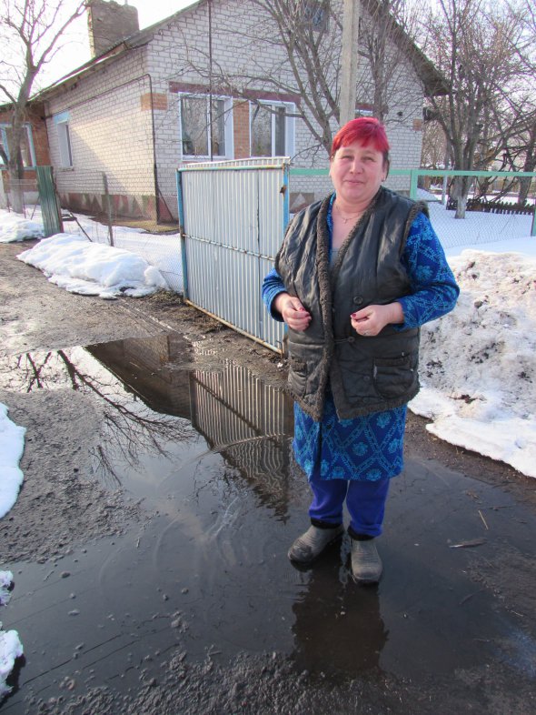 Через кілька хат миє вікна Надія Чегринець, 43 роки. Її помешкання межує з двором переселенців із Луганська. Виходить до воріт, йде по калюжі — взута в калоші. Поверх синього халата - жилет на ґудзиках.