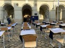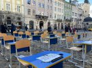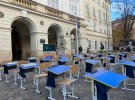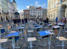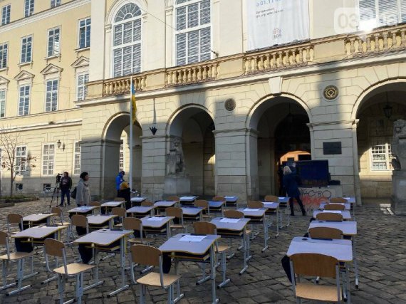 Організатори акції встановили парти біля міськради для привернення уваги до питання дистанційного навчання, пише 032.ua.