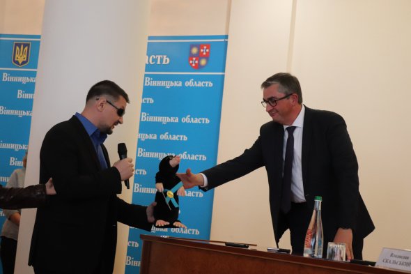 "Владислав Скальський приїжджав до нас ще рік тому як заступник мера. Постійно знаходимося з ним на зв'язку, не буду цього приховувати", - каже Ільницький. Із пакета дістає іграшкового крота і вручає його Скальському. Новий голова забув забрати подарунок після засідання.