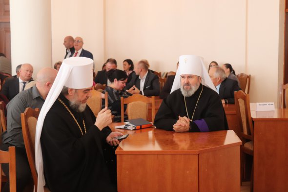 У залі обласної ради зібралися чиновники, серед яких керівники департаментів, міський голова та заступники, колишній голова ОДА Валерій Коровій і представники Української православної церкви.