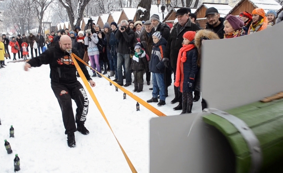 Рекордсмен Книги рекордів України та Гіннеса, львів'янин Олег Скавиш, на прізвисько "Тягнизуб" потягнув зубами 490 кілограмові сани з людьми