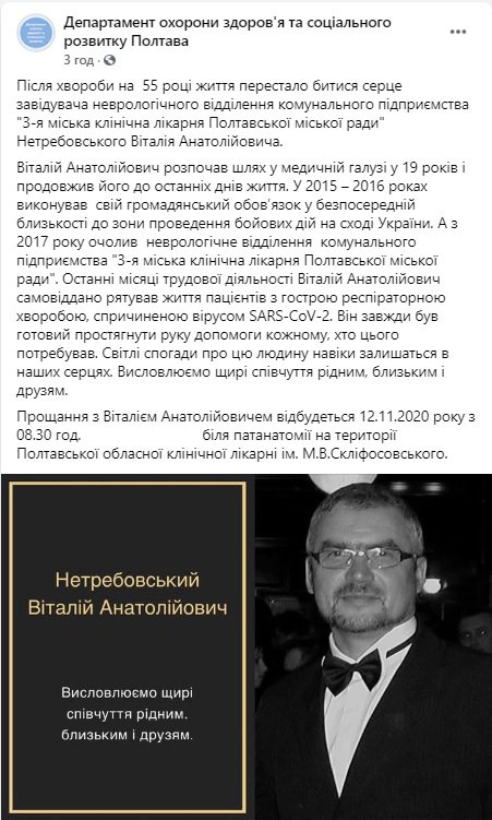 "Після хвороби на 55-му році життя перестало битися серце завідувача неврологічного відділення комунального підприємства "3-я міська клінічна лікарня Полтавської міської ради" Нетребовського Віталія Анатолійовича. Він розпочав шлях у медичній галузі у 19 років і продовжив його до останніх днів життя", - йдеться в офіційному повідомленні.