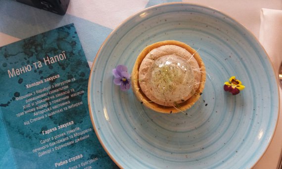 Шеф-кухар зробив вечір одеської кухні, бо вважає її інтернаціональною. Всі інгредієнти є виключно локальні. Працює шефом вже 20 років. Поки гості сходяться, в якості холодної закуски подають форшмак із барабулі з йогуртом та ромашковим ізомальтом.