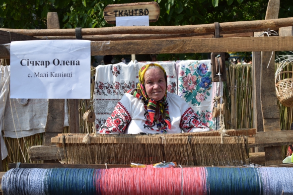 "Роблю доріжки із конопель більше 40 років. Воно натуральне, дихати легко. Одна жінка в Каневі взяла, щоб всі килими в хаті замінити. Я онуків навчила ткати. Верстату вже сотня років є. Сусіди викинули його, щоб порубать. Цілу зиму лежав надворі. Навесні побачила, просила сусіда віддати. Каже, що хотів на дрова. Я замість нього абрикосу дала порубати", – Олена Січкар із села Малі Канівці сидить за старовинним ткацьким верстатом. Одягнута у вишиванку і спідницю, яким близько 100 років.