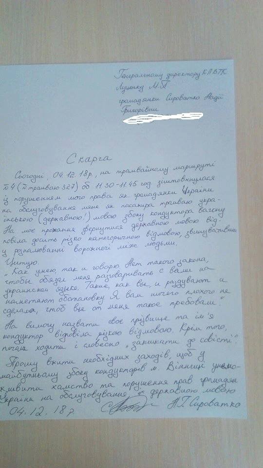 Інцидент стався у трамваї №4. Кондукторка відмовилась пояснювати українською мовою літньому чоловіку, де йому потрібно вийти. Вона висміяла пенсіонера, який не розумів російської мови. У Facebook про це написала місцева жителька Надія Сироватко.