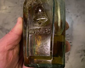 Пляшку з логотипом заводу "Шустов" викопали з глибини приблизно 1,3 м – на території заводу перекладають високовольтний кабель. Вочевидь, посудину піддів ковшем мініекскаватор, а помітили копачі, які працювали в траншеї. Директор музею був неподалік, тож одразу прийшов подивитися, чому зупинили роботи та власноруч дістав із землі знахідку.