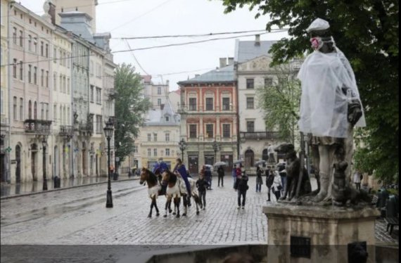 Скульптури усіх 4 фонтанів на площі Ринок одягли у захисні маски з написом "Дякую лікарю" та символічні медичні халати.
