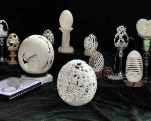 Полтавець Володимир Моторний створює візерунки на шкаралупі курячих, гусячих та страусиних яєць за допомогою різьблення. Має власну творчу майстерню.