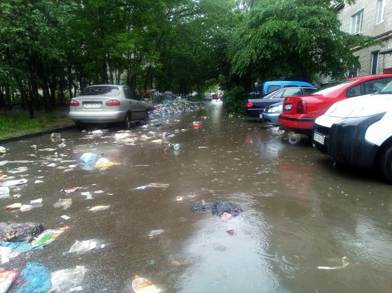 Користувачі у соцмережах публікують фото та відео, як за потоками води попливло невивезений непотріб.