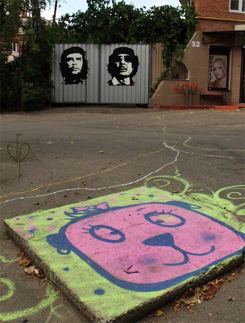 На вулиці Козицького на воротах зображені голови Че Гевари і Каддафі. Компанію їм складає куди більш дружелюбна мультяшна голова.
