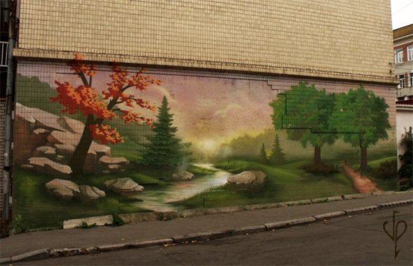 Один з чудових прикладів праці вуличних художників знаходиться практично на центральній вулиці міста - Соборній. Там, з тильного боку обласного БТІ, знаходиться зображення старого Нью-Йорка, з його традиційними жовтими таксі на тлі Манхеттенського мосту.