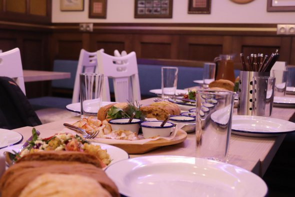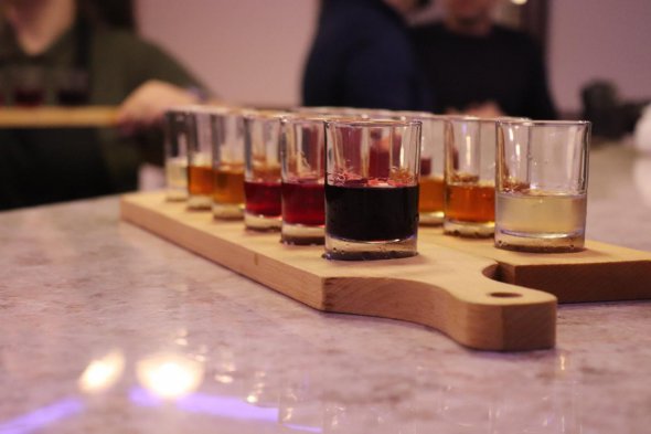 Перед тим як сісти за стіл продегустували 4 види напоїв власного виробництва. Офіціантка принесла овочеві салати, вареники з м'ясом, сало з хріном, свіжий багет та намазанки.