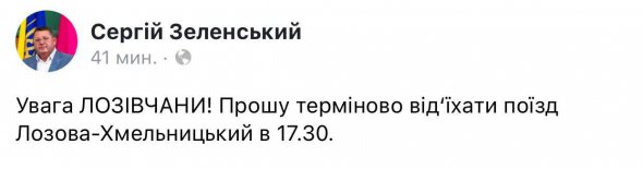 "Увага, лозівчани! Прошу терміново виїхати. Поїзд Лозова - Хмельницький в 17:30", - написав він.