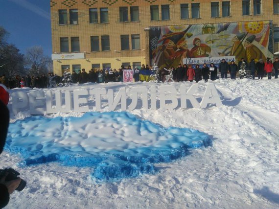 Сьогодні, 22 січня, в місті Решетилівка на Полтавщині зліпили із снігу 6-метрову мапу України. Її розмалювали у синій колір. Також місцеві створили живий "Ланцюг Єдності". Так відсвяткували сторіччя із Дня Соборності України.