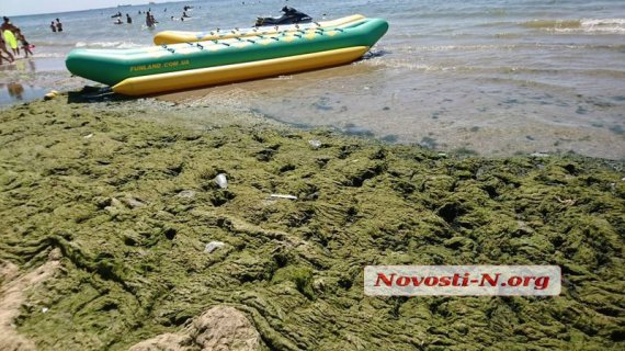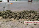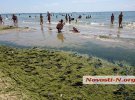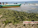 У курортному Коблево на Миколаївщині позеленів пляж. Весь берег густо вкритий шаром водоростей з медузами та сміттям.