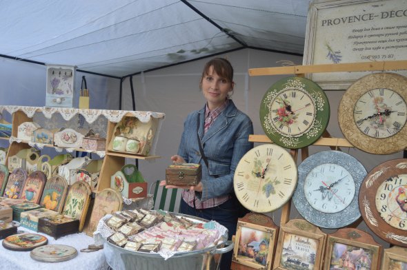 У центрі міста продає вироби з дерева, декоровані в техніці декупаж: шкатулки, годинники, сувеніри. До неї підходить жінка років 50. Звертається угорською.