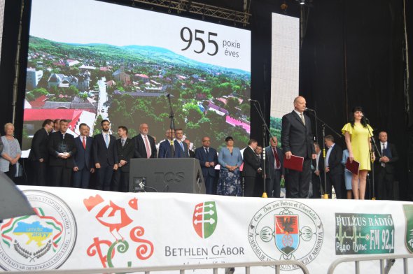 Під час урочистостей губернатор Закарпаття Геннадій Москаль починає свою промову угорською. Публіка аплодує. Згодом повторює все українською.
