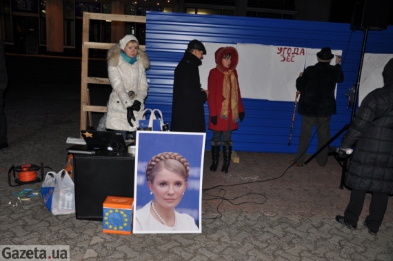 Активісти "Батьківщини" прийшли на площу з портретом екс-прем'єр-міністра Юлії Тимошенко, біло-червоними кульками та листівками з нагоди її дня народження.