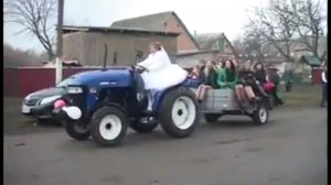 З двору наречена у білій весільній сукні виїжджає на тракторці. У причеп посідали дружки. На зустріч їй у строгому костюмі і також на тракторі їде наречений. У возі сидять хлопці.