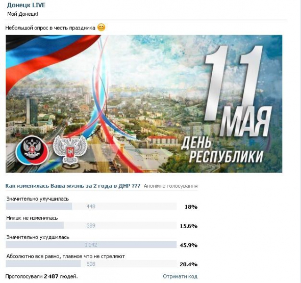 У соціальній мережі одна з донецьких груп влаштувала соціальне опитування, в якому проголосували майже 2,5 тисячі осіб.