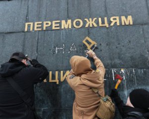 Замість відбитого напису, активісти фарбою написали "пам'ятник окупантам", пише ZAXID.NET
