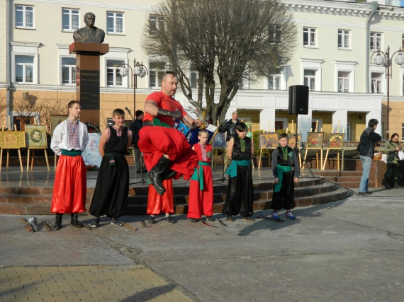 Хлопці з тренерської школи козацького гарту влаштували показове дійство козацького бойового мистецтва з елементами гопака.