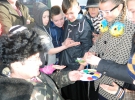 Брали різнокольорові гуашеві фарби. Малюнок виконували долонями. Усі охочі намагалися швидко нанести фарби на полотно, бо від яскравого сонця вони висихали миттєво.