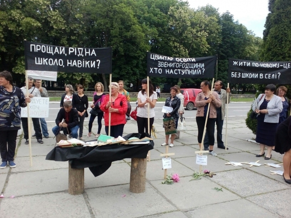 Люди прийшли до районної ради з табличками: "Довбуш + Кучер + Кочерга = смерть села?", "Не будуєте, то хоч не руйнуйте", "Прощай, рідна школо, навіки?", "Цвинтар освіти Звенигородщини. Хто наступний?". "Жити по-новому – це без школи в селі?".