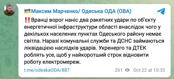 Вранці 22 жовтня ворог завдав два ракетні удари по об'єкту енергетичної інфраструктури Одеської області.