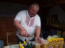 "Меду у 2017-му було мало. Проте зібрали все, що було і привезли на ярмарок, аби люди могли насолодитися і оздоровитися натуральним напоєм", - сказав бджоляр із Миргорода Сергій Тулинський. Навколо нього — рій бджіл. Одна кусає його за шию. Це допомагає зняти біль у м'язах, додав чоловік.