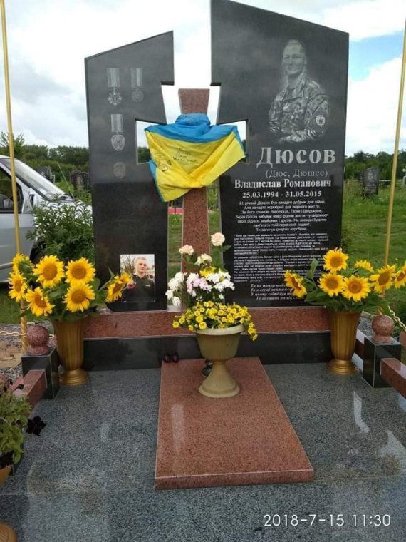 Владислав Дюсов загинув внаслідок важкого поранення в Широкино у 2015 році. Серед побратимів був відомий як Дюшес. Саме так і написали на пам'ятнику.