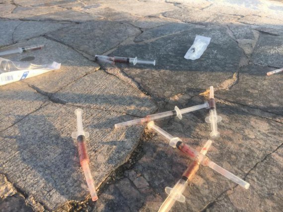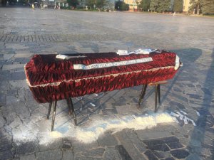 19 липня у Кременчуці Полтавської області серед міста виставили труну. Навколо розкидали шприци та розсипали муку.