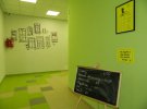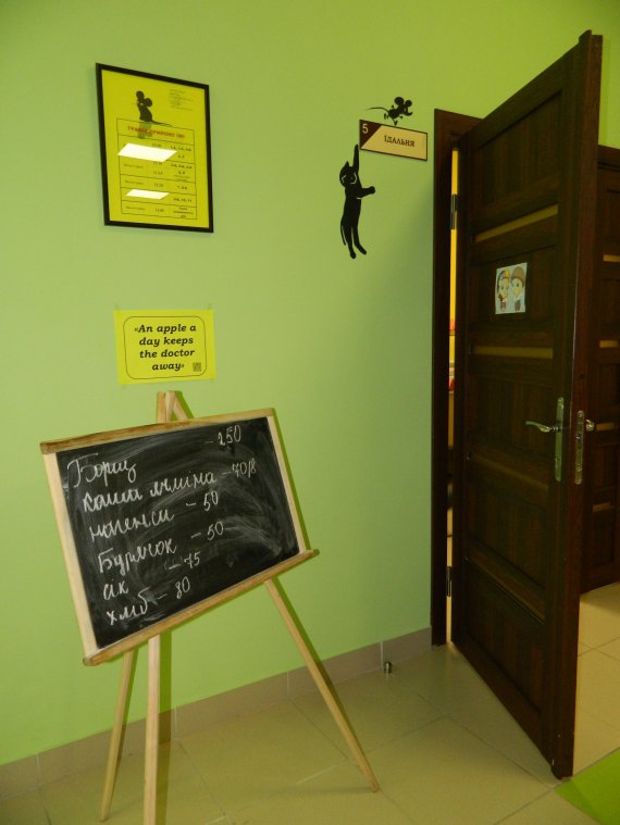 В їдальні, як і в самій школі, хочеться не лише обідати, й просто знаходитись. Стіни пофарбовані у спокійні жовто-фіолетові кольори. Встановлена барна стійка та сучасні зручні столи з різнокольоровими табуретками.