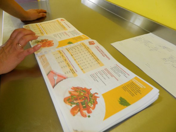 "Наприклад можна приготувати яскраві соковиті морквяні котлетки або капустяний шніцель. Капуста пропарюється і потім в сухарях запікається в духовці. Смажених страв практично немає. Клопотенко у своєму збірнику страв пропонує смажену рибу, картоплю. Не погоджуюсь з ним. Я би ці страви не брала у шкільне меню. Хіба десь там раз. За місяць ми ще жодного разу не повторили меню. Крім рецептів Клопотенка, маємо свої доволі цікаві в подачі. Багато салатів в Жені не можемо зробити, бо інгредієнтів просто немає в тендерних закупівлях", - пояснює кухар. Гортає збірку рецептів кухаря Євгенія Клопотенко.