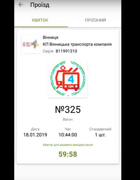 Після сканування на екрані можна побачити суму за проїзд, після чого натиснути "Придбати". Тоді з'являється квиток з серійним номером, видом транспорту, його номером, датою та часом видачі. Після чого треба натиснути "Закомпостувати".