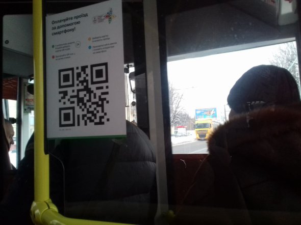 У Вінниці відсьогодні у громадському транспорті з'явилися наліпки з QR-кодом. Вони дозволяють пасажирам платити за проїзд, не використовуючи готівку.