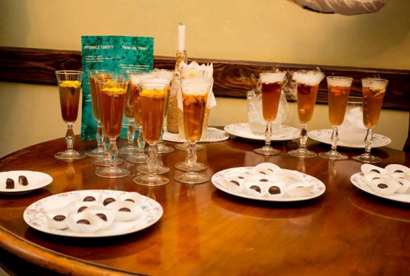 Гостей зустрічають шаманським із чорнобривців та цукерок із хрону. Для ефекту в напій кидають сухий лід, напій парує, гості відпивають несміливо, але від насолоди зажмурюють очі. Під звуки бандури гості насолоджуються процесом та сідають за столи.