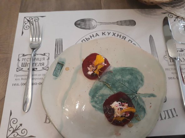 Крізь вікно відкритої кухні можна побачити магію приготування страв. На тарілку викладають закуску. Це маринований буряк з сиром та мармеладом з чорнобривців.