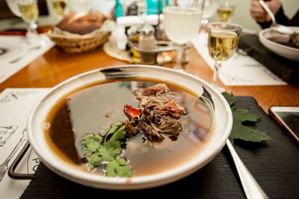 "Таку подачу зробили спеціально, щоб гості оцінили красу коралового гриба. Цей різновид грибів збираємо у наших лісах. Я найбільше люблю рожеві гриби, після теплової обробки вони залишають красивий колір. Коралові гриби примхливі, їх ризиковано переварити і всі ріжки пообпадають. Тому ми проварюємо лише раз, щоб зберегти структуру гриба. М'ясо для супу варили 12 годин. Пшеницю вимочували стільки ж, потім проварювали", - каже Михайло.