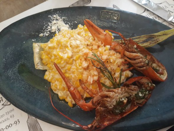 На рибну страву приносять кукурудзяну кашу з раками. Раків розрізали навпіл, щоб зручніше було з'їсти.