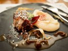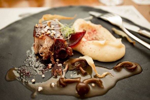 Гарячу м'ясну страву - ребра барбекю подають на пюре з пастернака з чіпсами з пастернака та попкорном із сорго. Хоча страва здається дуже складною, але це звичний для хмельниччан наїдок.