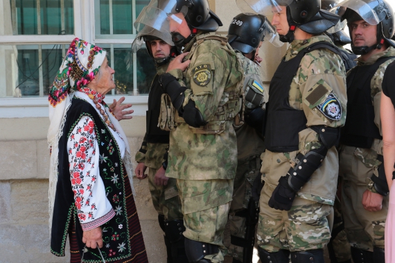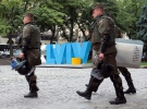 Об 11 ранку в дворику Ратуші шикуються силовики із Нацгвардії. Кілька чоловік без шоломів та щитів. Старший, у званні полковника, звертається до силовиків: