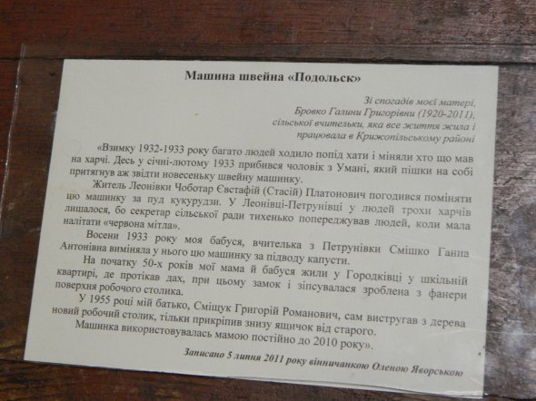 "Відома вінничанка Олена Яворська подарувала музею швейну машину, яка в роки Голодомору врятувала родину з міста Умань. Голова сім'ї на санчатах привіз ту швейну машинку в одне із сіл Крижопільського району. Це приблизно 150 кілометрів. За неї він отримав підводу капусти. Потім ця машинка врятувала родину Яворських в голодні 1946-1947 роки. Тоді за роботу швеї отримували продукти. Обшивали усіх односельців у селі", - додає Лариса Семенко.