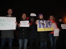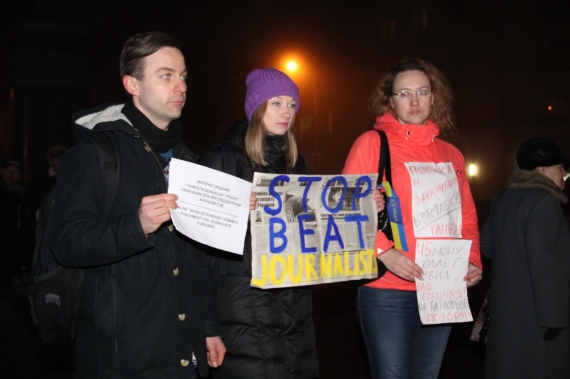 Увечері в середу на донецькому євромайдані пройшла акція журналістської солідарності. Всього 8 чоловік - співробітники місцевих і центральних видань та блогери публічно зажадали ефективного розслідування звірячого побиття журналіста і активіста Євромайдану Тетяни Чорновол. Колеги скандували: "Безкарність вбиває" та "Ми не боємося". Тримали плакати: "45 моїх колег побив ваш спецназ на Банковій. Ганьба!", "Влада – звірина!", та інші.